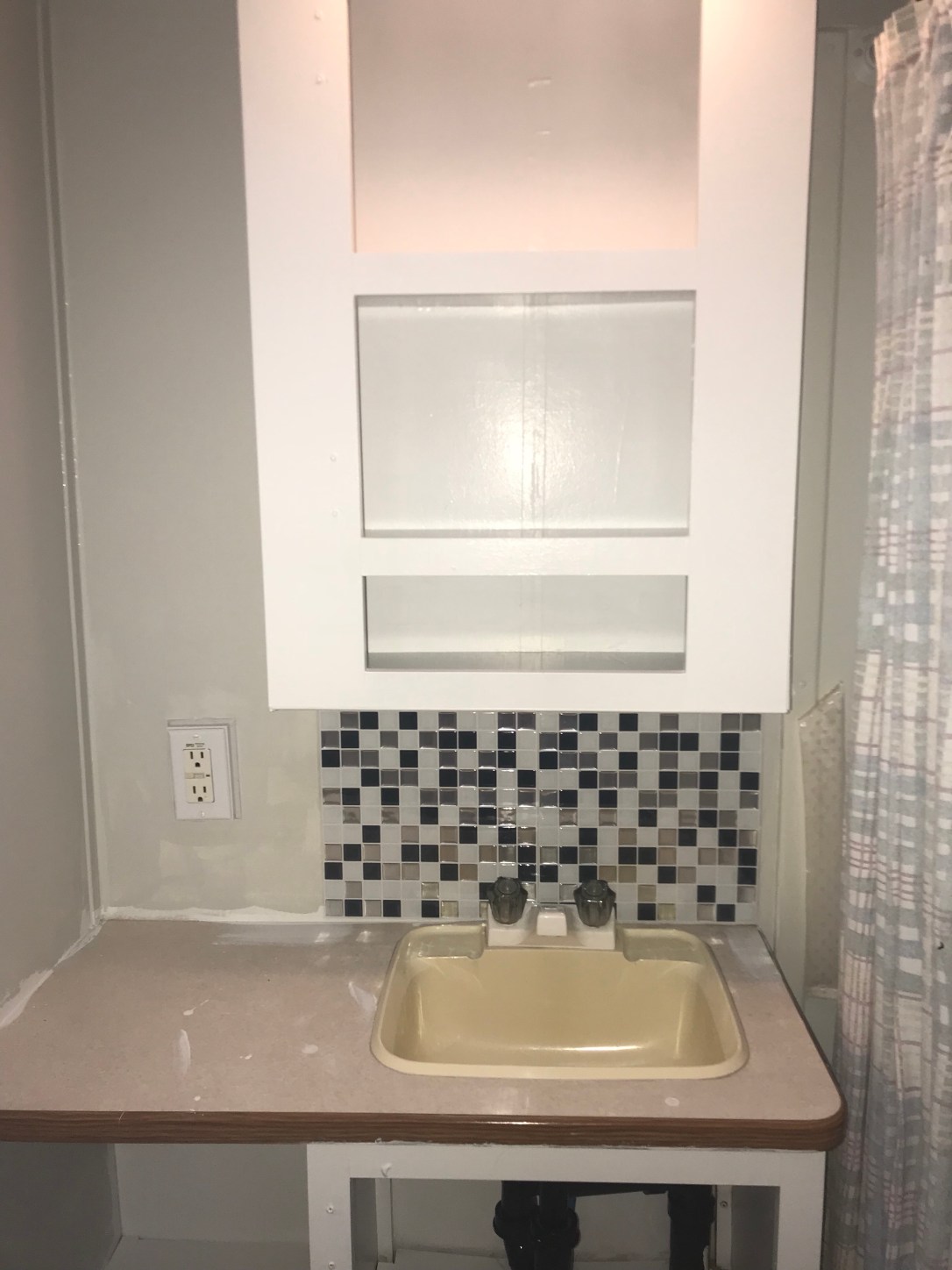 – I added a vinyl backsplash to the bathroom. I was told by my husband that I went too far by starting that. He’s probably right, that could have waited until more has been accomplished. I just love the way it looks.