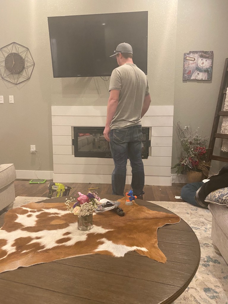 I purchased the Samsung Frame TV so that the TV would look more like artwork on the wall, rather than a TV. The TV comes with a box that the TV plugs in to, so we cut a hole in the wall and built a shelf to set the box in so that all cords would be hidden behind the TV. We already had an outlet in there, so that didn’t need installed, which made this project pretty easy!